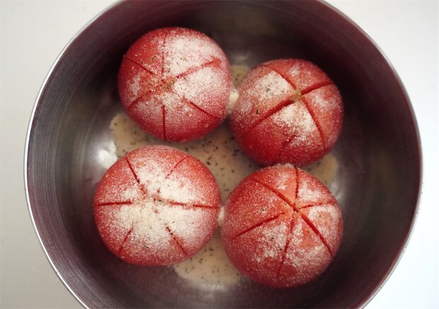 トマトはヘタの部分を下にして並べ、ボウルに残った浅漬けの素も加えました。
