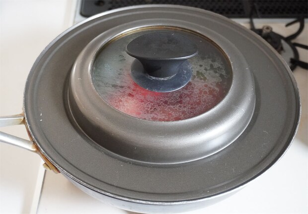 4.3にトマトを加えてフタをして、弱火で10分蒸し焼きにする。