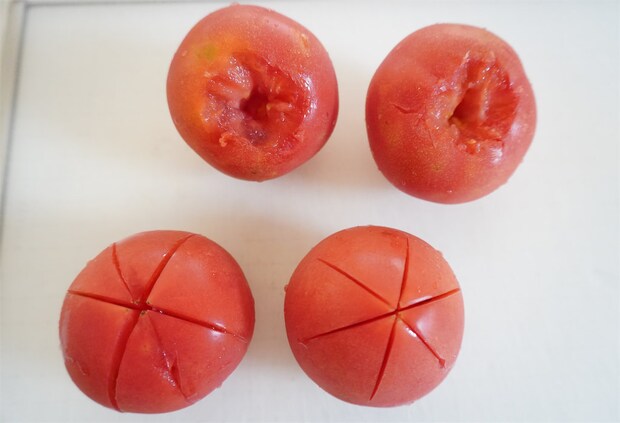 1.トマトはヘタをくり抜いて、反対側に6等分に切り込みを入れ、浅漬けの素を振っておく。