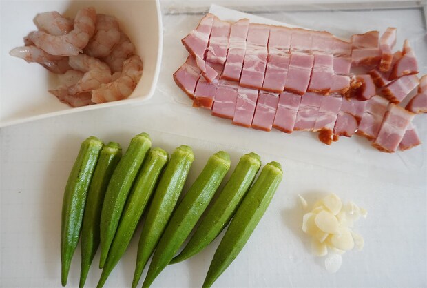 2.オクラはヘタを切り落とし、ガクを薄く剥く。にんにくは薄切り、エビは背わたを取り、ベーコンは1cm幅に切る。
