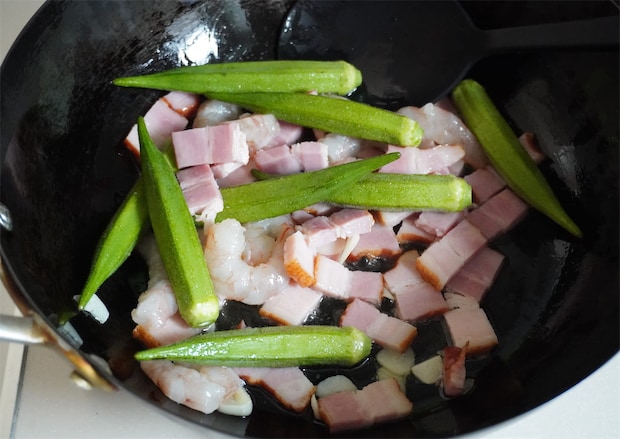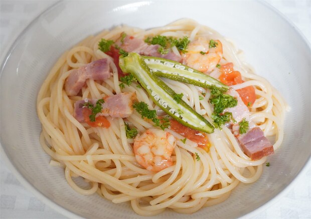 3.深めのフライパンにオリーブオイルとにんにくを入れて弱火にかけ、香りがしてきたらオクラとエビ、ベーコンを加えて中火でサッと炒める。