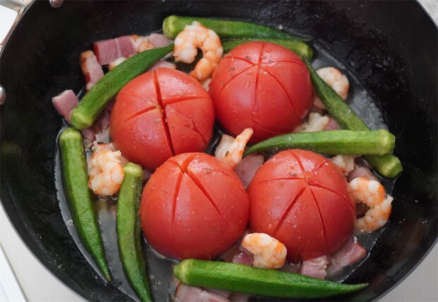 浅漬けの素でお店の味に!「丸ごとトマトとオクラのアヒージョ風」