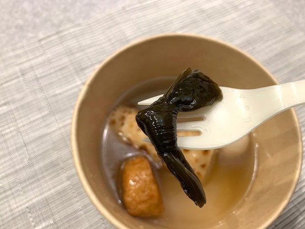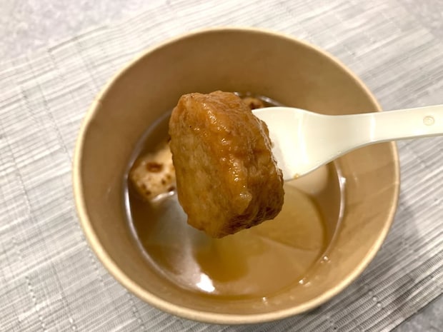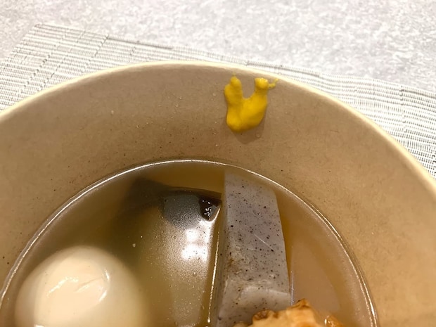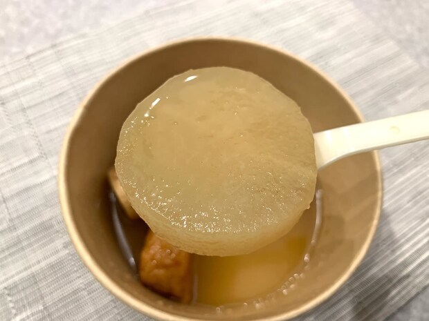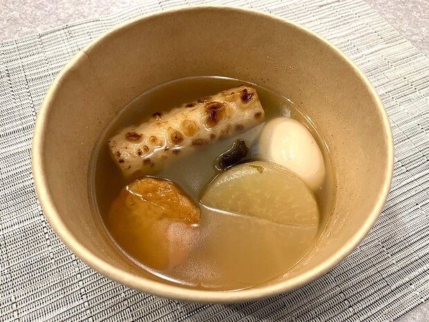 熱々の状態で提供される、寒い季節にぴったりな一品。大きい容器の中には大根、ちくわ、たまご、さつま揚げ、こんにゃく、昆布の6種類の具材が入っていました。