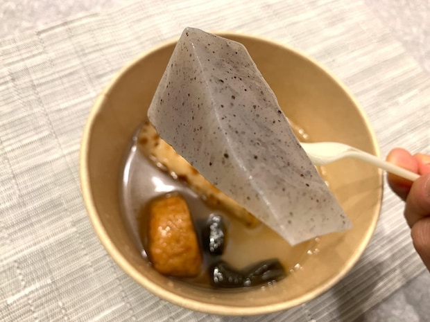 こんにゃくはプルプルした弾力があり、大根やちくわなどとはまた違った食感を楽しめます。他の具材よりも一層あっさりした味わいなので、口の中を少しリセットしたいときにもぴったりですよ!