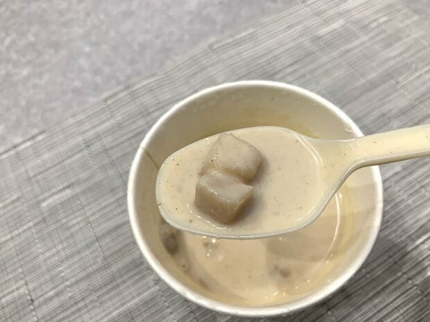 クラムチャウダーに比べると少しサラサラしていますが、それでもとろみで温かさが持続しそうなスープ!中には鶏むね肉やマッシュルーム、じゃがいも、みじん切りの玉ねぎがゴロゴロ入っていました♪