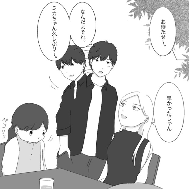 そして、「お待たせ~」アツシくんがやって来ると、「早かったじゃん」とカナコが言い、「なんだよそれ」と言い返した後、「ミカちゃん久しぶり~」と声をかけられ、頭をペコリと下げました。