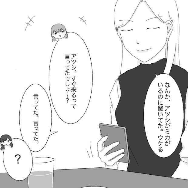「なんか、アツシがミカがいるのに驚いてた。ウケる」カナコの言葉に、「アツシ、すぐ来るって言ってたでしょ~?」とモカが言い、「言ってた。言ってた」とやりとりする2人に私は意味がわかりませんでした。