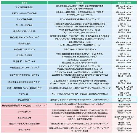 宇宙を体験する場を創出する宇宙ベンチャー・アストロコネクトによる「天井プラネタリウム」上映・ワークショップ、プログラミングでロボット操作、3DキャラクターづくりとVtuber体験、AI・VRやロボティクスのワークショップも実施される。