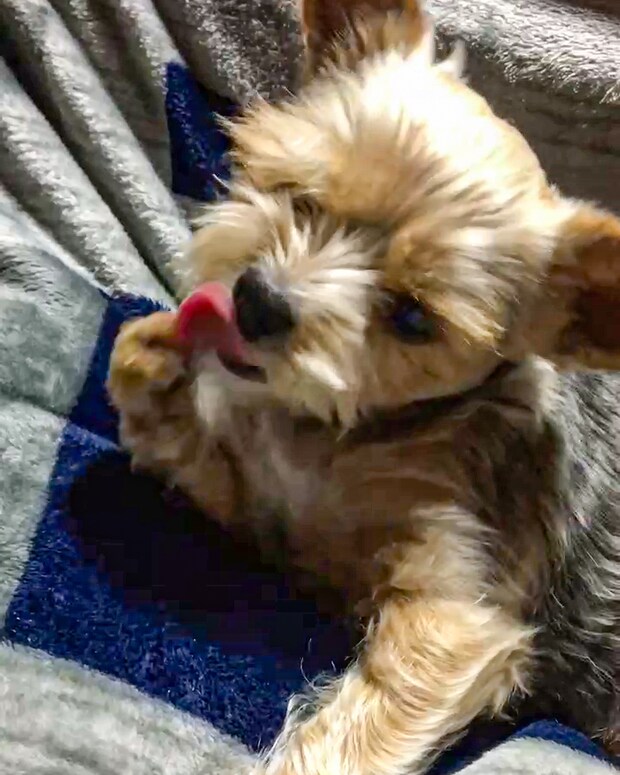 猫が手で顔周りを洗う仕草はよく見かけますが、犬もこんな仕草をするんですね…!ちょっと驚きです。