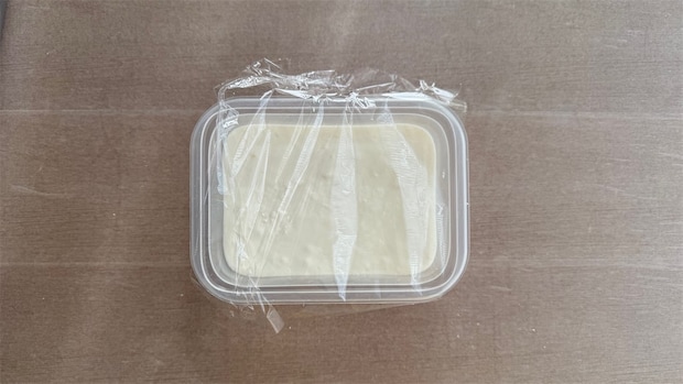 2. コンテナに入れ、型ごとトントンと数回、台の上に落として空気を抜く。ふんわりとラップをかけ、電子レンジで2分加熱する。