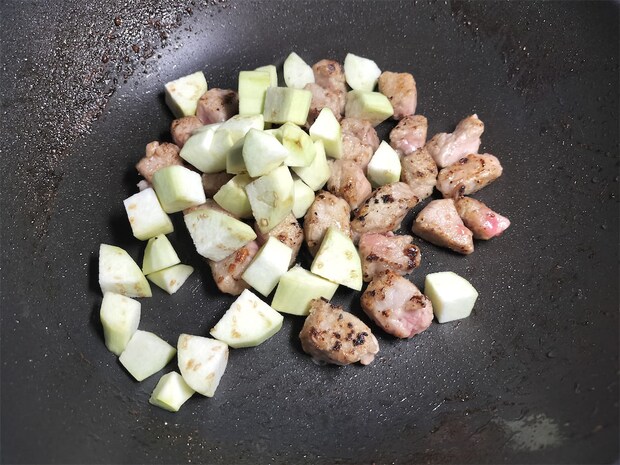 6. オリーブオイル小さじ1となすを加えて炒めます。