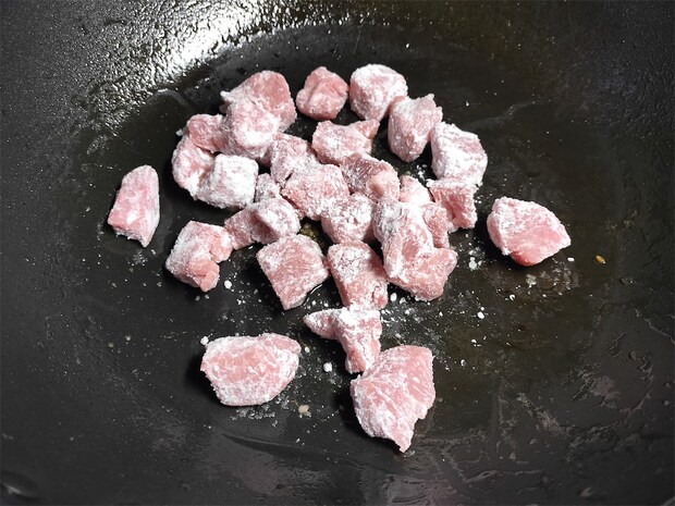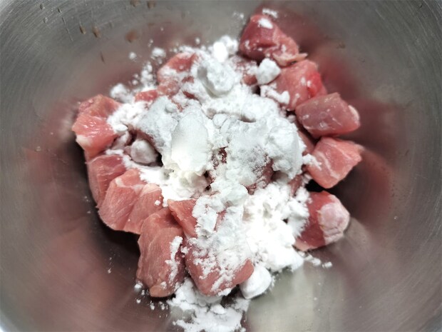 1. ボウルに赤身を入れ、片栗粉をまぶします。