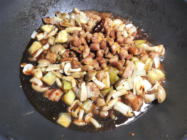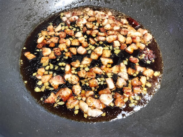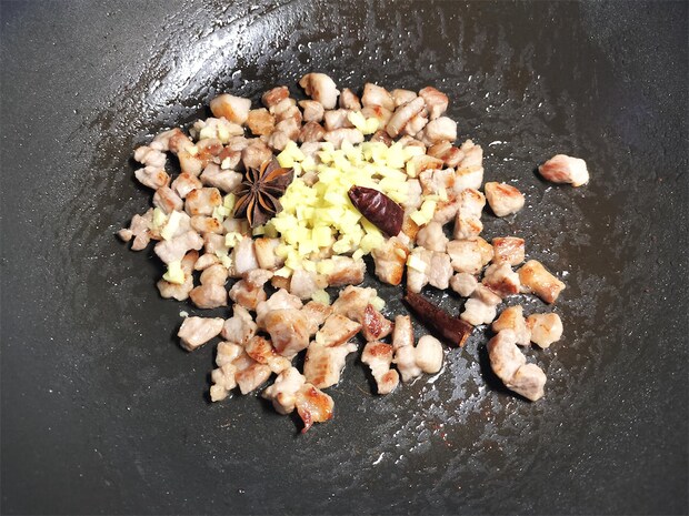 3. しょうが、赤唐辛子、八角を加えて炒めます。