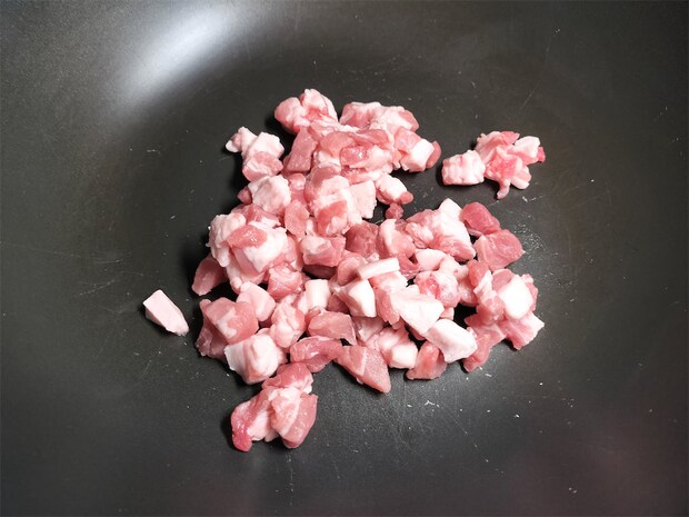2. フライパンを中火にかけて脂身を入れ、色づいて脂が出てくるまで炒めます。