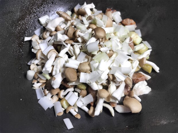 7. なす全体に油が回ったらしめじと長ねぎを加え、全体的に香ばしくなるまで炒めます。
