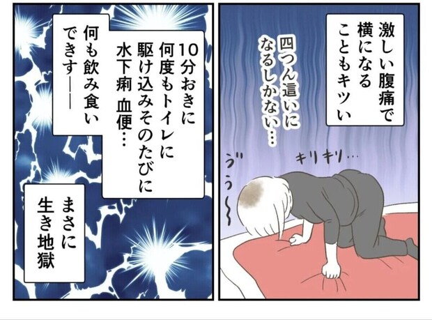 症状はどんどん悪化していき、血便や発熱まで起こり、あまりの激痛で横になることすらできなくなっていた尾持さん。救急車を呼ぶことが頭をよぎりますが、コロナ禍のため救急車を呼ぶことを躊躇していました。しかし、自力で病院へと向かうのは無理だと判断し悩んだ末に救急車を要請します。