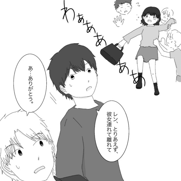 「わぁぁああああああ!!」周りの人達に連れて行かれた女性を見つめながら、「レン、とりあえず、彼女連れて離れて」アツシくんがそう言うと、「あ・・ありがとう」そう言ってレンはその場を離れました。
