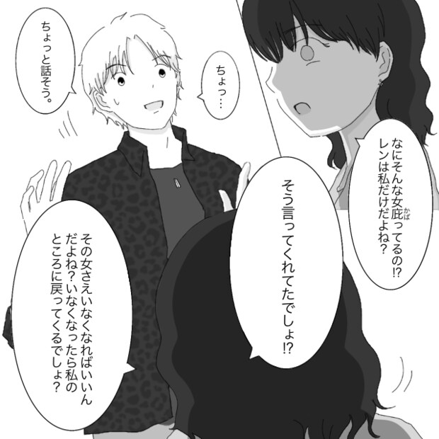 すると、「なにそんな女庇ってるの!?レンは私だけだよね?そう言ってくれてたでしょ!?」無表情でそう呟く女性に、「ちょっ・・ちょっと話そう」とレンが言うも、「その女さえいなくなればいいんだよね?いなくなったら私のところに戻ってくるでしょ?」と言う女性は、