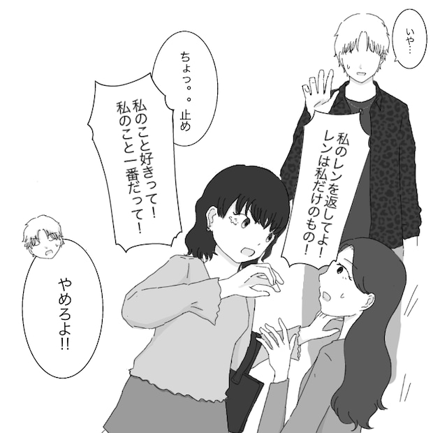 「いや・・」と動揺するレンの前で、「私のレンを返してよ!レンは私だけのもの!」と掴みかかろうとし、「ちょっ。止め・・」レンの声を遮って、「私のこと好きって!私のこと一番だって!」と言う女性に、「やめろよ!!」と声を荒げるレン。