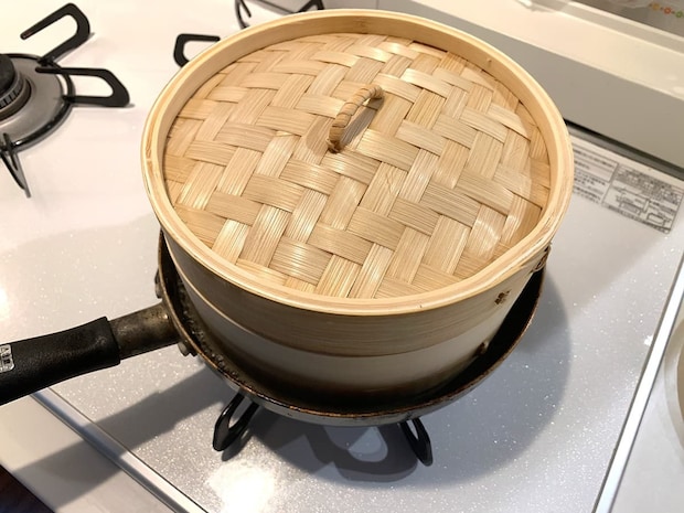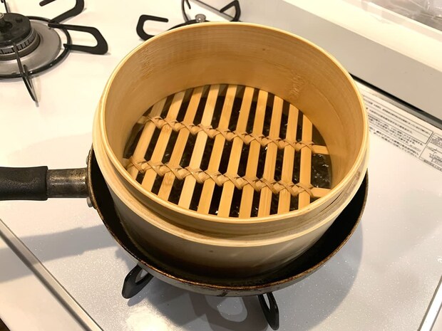 せいろは沸騰したお湯が入ったお鍋の上に置き、蒸気で食材を蒸す調理器具です。しかし、我が家にせいろ専用の蒸し鍋がなかったので、今回はフライパンで代用してみました。