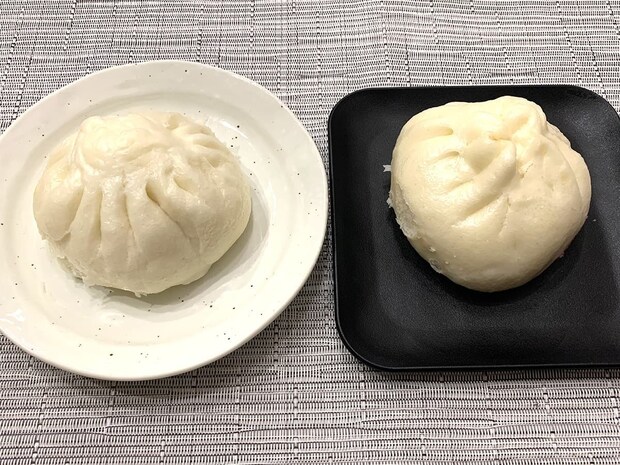 電子レンジでも調理可能な冷凍中華まんだったので、それぞれの方法で温めたものを並べてみました。左の白いお皿が電子レンジで温めた中華まん、右の黒いお皿がせいろで蒸した中華まんです。