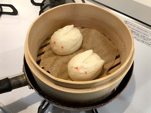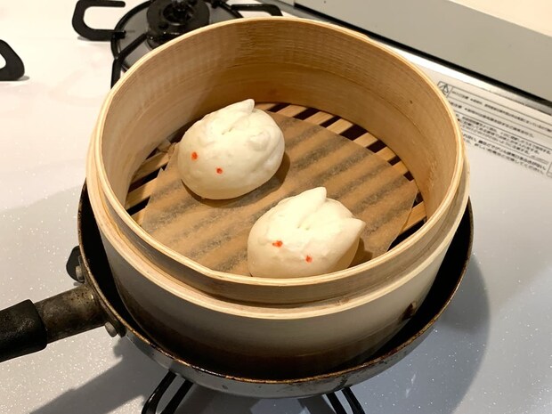 先ほどの中華まんと異なり、本品には底に敷き紙が付いていないので、うさぎまんの下にクッキングシートを敷いて皮がせいろにくっつかないようにします。約10分せいろで蒸し上げたうさぎまんがこちらです。