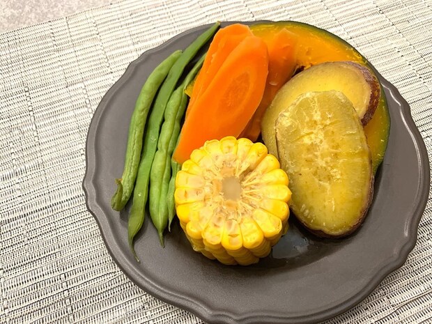 最後に、にんじん・いんげん・さつまいも・かぼちゃ・とうもろこしを入れて温野菜を作ってみました。
