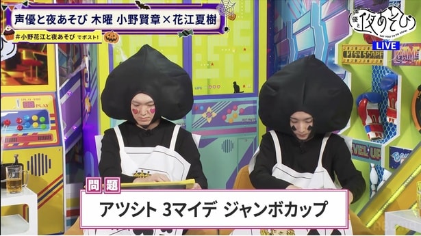 山下と小林から「何があったんですか!パッと見、何がモチーフかわからないですよ!」「もう梅干しだよ!」と総ツッコミを受けるなか、花江は「ハートの女王だよ!」と即答。花江の気合いの仮装に、視聴者からは「誰!?」「顔全塗りわろた」などコメントが飛び交った。