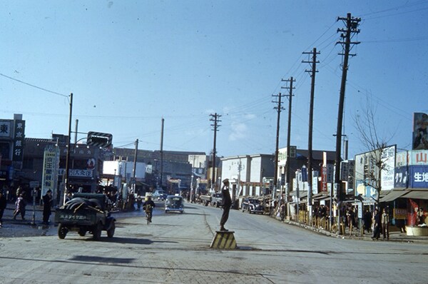 上の写真は、1950年頃の渋谷スクランブル交差点。当時交通信号機が普及しておらず、手信号で交通整理が行われていた。