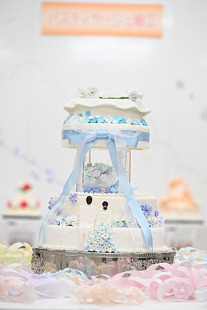 展示では、パン細工、飴細工、チョコレート細工、シュガークラフト、ウエディングケーキが並ぶ。