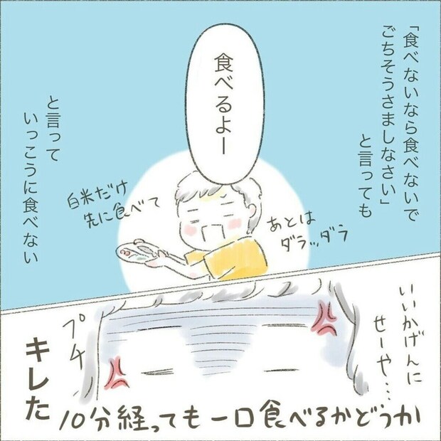 ある日、何度注意をしてもしっかり座ってご飯を食べない長男のけーくん。なかなかご飯が片付かずだんだんイライラしてきたせせらぎさん…。ついには堪忍袋の緒が切れてけーくんにある罰を課します。