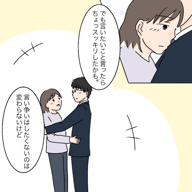 「でも言いたいこと言ったらちょっとスッキリしたかも、言い争いをしたくないのは変わらないけど」と笑いながら言いました。義母にやっと自分の気持ちを伝えられたことで、前よりも強くなれた気がしました。
