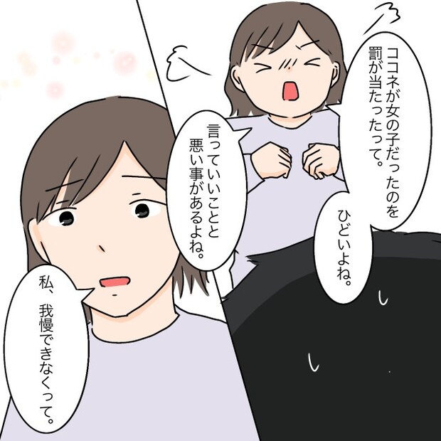 昼間、義母に言われた言葉を思い出して、またじわじわと怒りが込み上げてきました。「ココネが女の子だったのを罰が当たったって言ったの、言っていい事と悪い事があるよね」私は怒りながら言いました。こんなに怒っているのが珍しいのか、ユウタは驚いた表情で私を見ます。