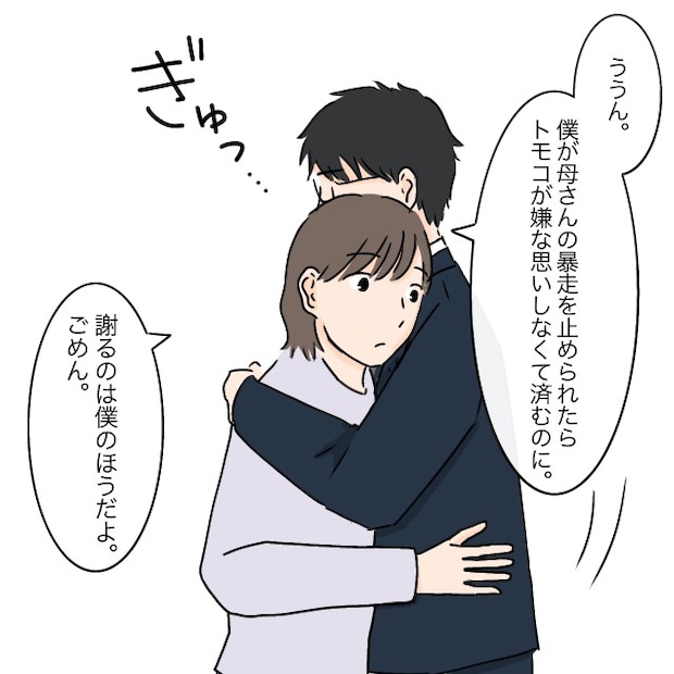 「私、我慢できなくって」そう言うと、ユウタは私を優しく抱きしめ、「ううん、僕が母さんの暴走を止められたらトモコが嫌な思いしなくて済むのに・・・謝るのは僕のほうだよ、ごめん」と言いました。