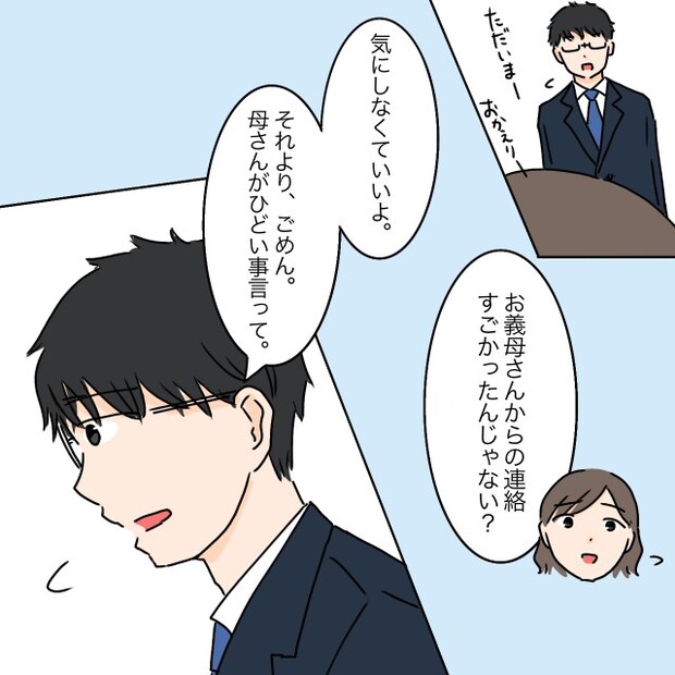 しばらくして、ユウタが仕事から帰ってきました。私は「お義母さんからの連絡、すごかったんじゃない?」と聞きました。あの義母のことだから、ユウタに文句を言っているに違いありません。するとユウタは「気にしなくていいよ、それよりごめん、母さんがひどい事言って」と申し訳なさそうに謝ります。