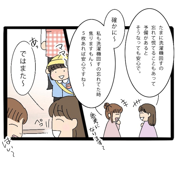 「たまに洗濯機回すの忘れて慌てることもあって、予備があるとそうなっても安心で」ユズちゃんママの言葉に、「確かに~。私も洗濯機回すの忘れてた時焦りますもん〜。5枚あれば安心ですね~。参考になります~」と話した後、「ママ~」ユズちゃんがやって来て、「ではまた〜」挨拶して別れました。