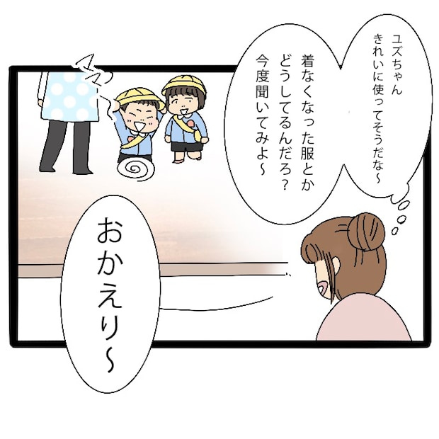 「ユズちゃん、きれいに使ってそうだな~。着なくなった服とかどうしてるんだろ?今度聞いてみよ~」そう思っていると、そらとせらがやって来て、「おかえり~」と声をかけました。