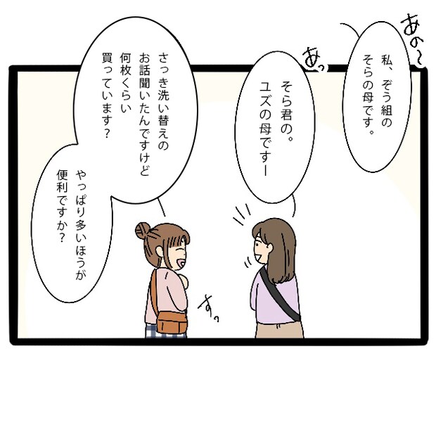 そして、「あの~、私ぞう組のそらの母です」と挨拶すると、「あっそら君の。ユズの母ですー」とそらと同じクラスのママであることが判明。「さっき洗い替えのお話聞いたんですけど、何枚くらい買ってますか?やっぱり多い方が便利ですか?」とたずねると、