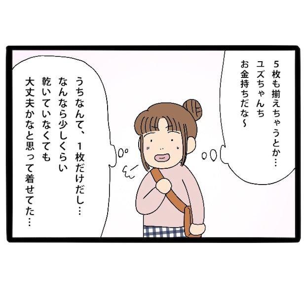 「5枚も揃えちゃうとか・・ユズちゃんちお金持ちだな~。うちなんて、1枚だけだし・・なんなら少しくらい乾いていなくても大丈夫かなと思って着せてた・・」と心の中で独り言。