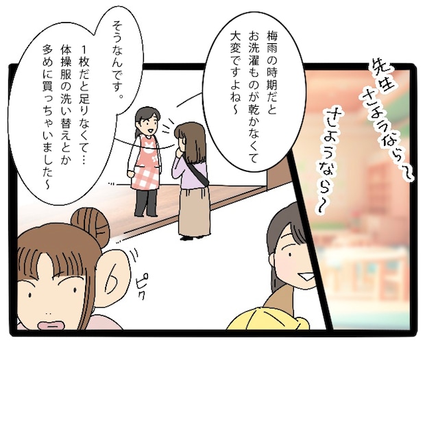「梅雨の時期だとお洗濯ものが乾かなくて大変ですよね~」先生にそう言われ、「そうなんです。1枚だと足りなくて・・体操服の洗い替えとか多めに買っちゃいました~」とママさんが話しているのを聞き耳を立てていた私。