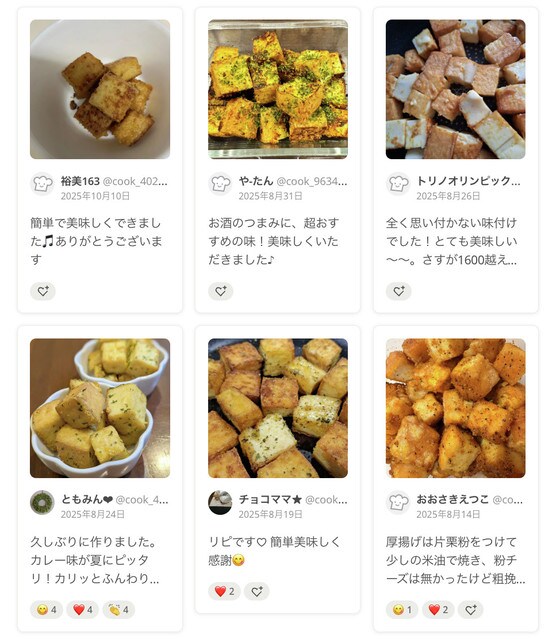 つくれぽ(みんなのつくりましたフォトレポートのこと)でも、「カリッとふんわり、おいしくいただきました!」「カレーのスパイシーさやチーズのコクで、お酒にも合う!」といった声がたくさん届いています。
