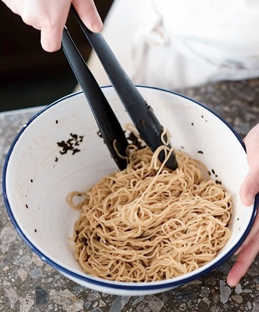 POINT_麺は水でしっかり洗い、ぬめりを除くことが大事!さらに塩昆布と混ぜ、麺自体に旨みと塩味をプラスすると、味がボヤけない。