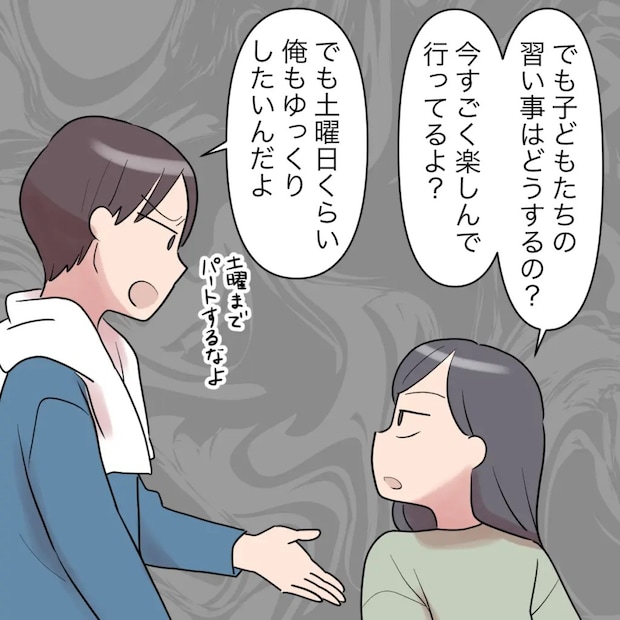 これまでのように家事はできなくなると宣言した私に、その時は塾代を稼いでほしいことしか考えておらず「少しくらいは目を瞑る」と上から目線で言っていたユウタは、私が必要最低限の家事しかしなくなったことで目に見えて散らかりだした家や自分の事を自分でしなくてはならない現状に不満のようで「家のことができないなら働くのやめなよ」と言ってきたのです。この家の人たちの自分勝手さに呆れました。