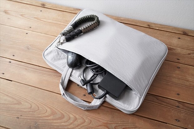 マウスやアダプター、A4ファイルも収納可能な2か所の外ポケットスーツにもカジュアルにも合わせやすいシンプルなデザイン。シワ感のあるナイロン生地は、ビジネスすぎない上品さを演出し、はっ水加工で水滴や汚れにも強い仕様です。