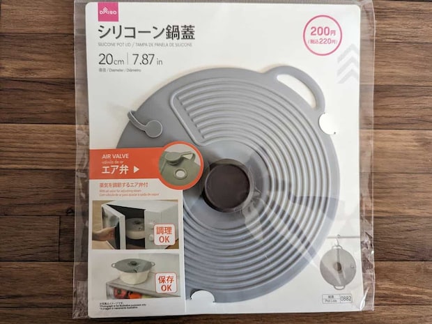 ダイソーの「シリコーン鍋蓋」をご紹介します。軽くて収納場所を取らず、予備の鍋蓋としてぴったり!15cm、20cm、22.5cm、27.5cmと豊富なサイズで、カラーはキッチンになじみやすいグレーとアイボリーです。今回はグレーの20cmをお試ししてみます。