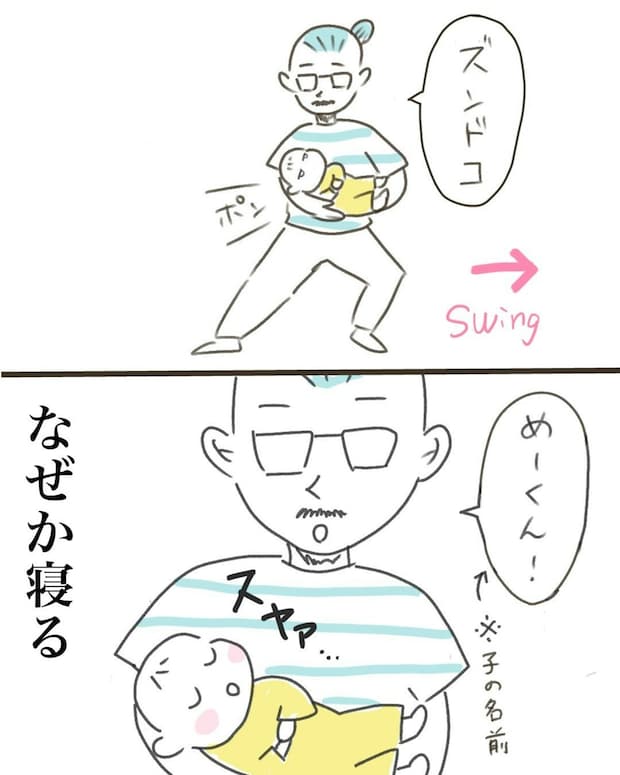 どんなにギャン泣きしていても、8割の確率でスヤァ…と寝るそうで、パパの「ズンドコリズム」が、赤ちゃんにぴったりハマるらしく、「めーくん!」と言うころには夢の中へ。その光景に、ママもつい「なんでそれで寝るの!」とツッコミたくなりますね。