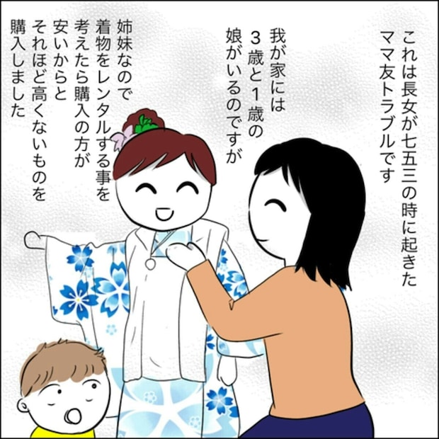 娘の七五三に向け着物を購入したフォロワーさん。ある時、ママ友の麗華から七五三の着物をどうするか聞かれ、購入した着物の写真を見せてあげることに。麗華の表情が何だか気になりますが、フォロワーさんは全く気付いていないようですね。
