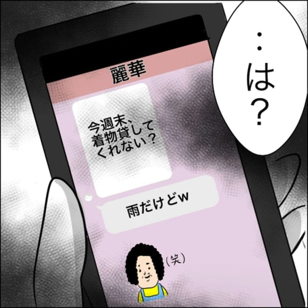 ある時、麗華から「今週末着物を貸してくれない?」と連絡をもらったフォロワーさん。まだ娘も着ていない着物を貸すことに抵抗を感じ理由を聞こうとしますが、ママ友は「雨だけどw」と非常識なメッセージを送ってきます。