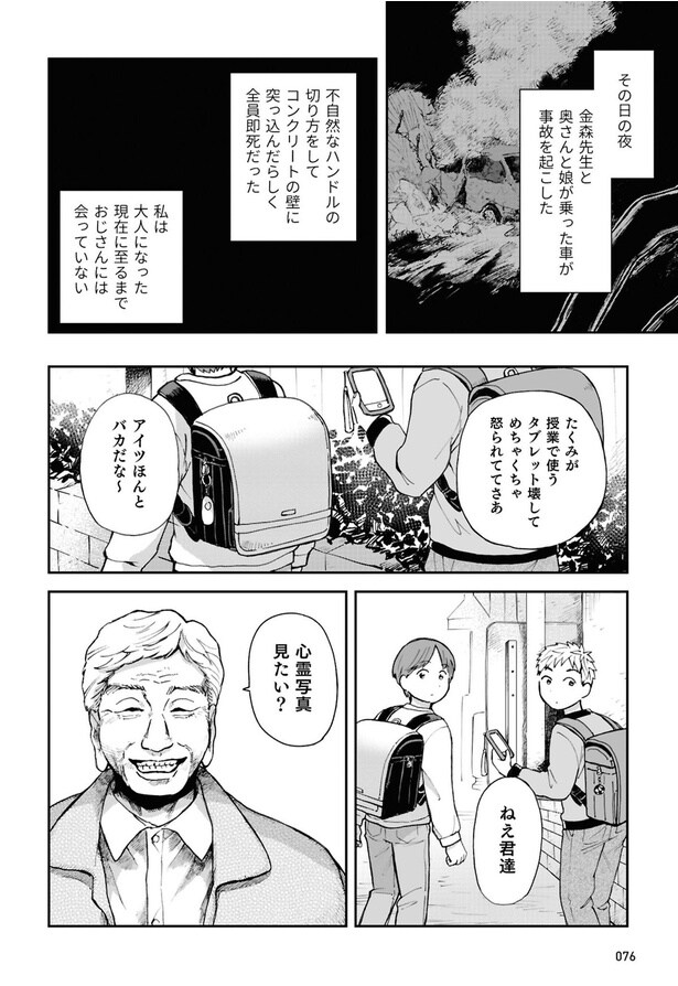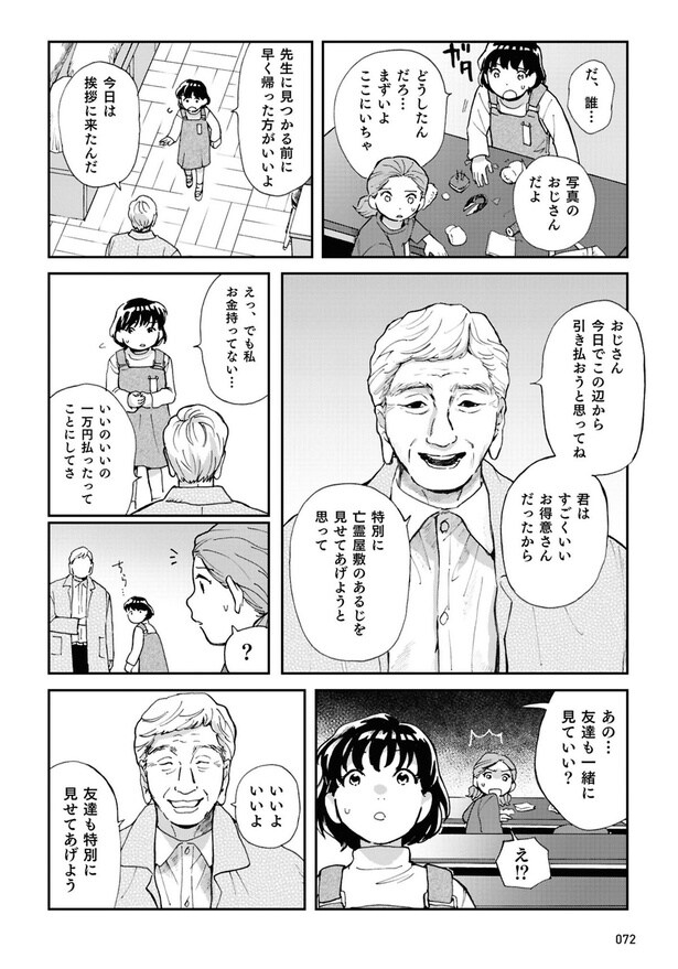 前回、“亡霊屋敷のあるじ”が学校の先生なのではないかと疑った女の子。すると、おじさんは「特別に」と“あるじ”が鮮明に映る写真を見せてくれた。そこに映っていたのは、まぎれもなく学校の先生で、その写真を見た日の夜…?