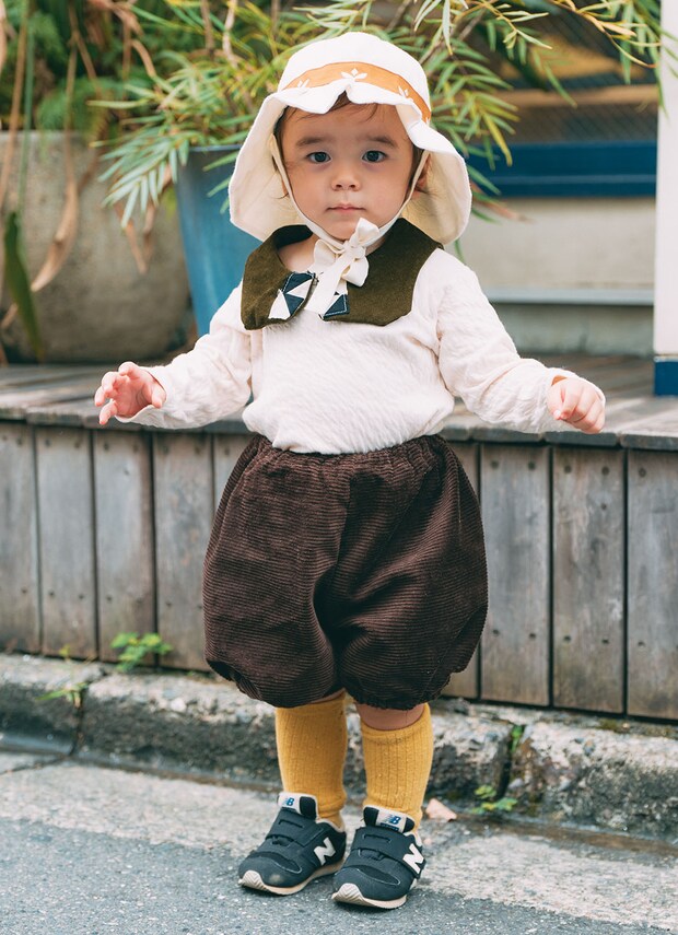 ぷっくりシルエットが可愛いかぼちゃパンツをはいてご満悦♡ プレーンなトップスにつけ襟を合わせてクラシックなムードをオン。ブラウン×アイボリーでまとめたコーデに、黄色の靴下をアクセントにし、チューリップハットで遊び心をプラス。秋らしい色使いと小物使いがお上手♪